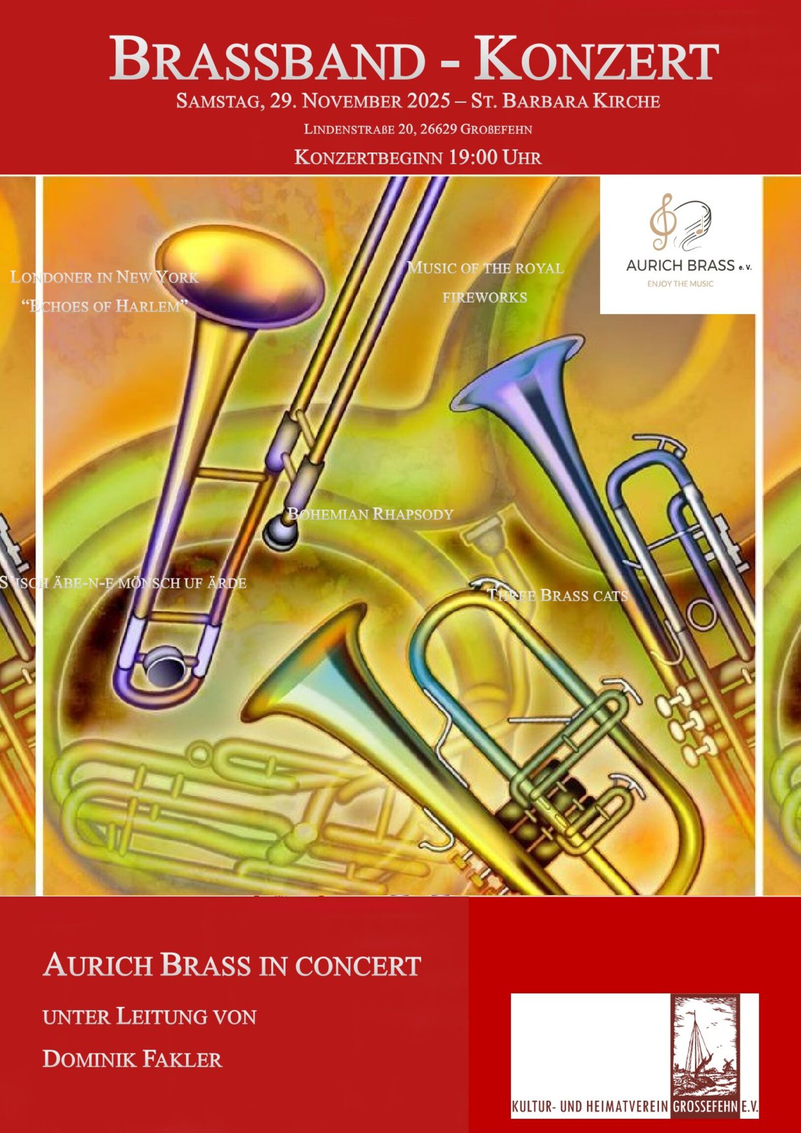 Die Auricher Brassband „Aurich Brass“ spielt gemäß ihrem Motto „Enjoy the Music“ Musik zum Genießen.Die etwa 30-köpfige Band arbeitet nach eigenem Bekunden stets intensiv daran, Intonation, Rhythmus und Zusammenspiel als Grundpfeiler für einen guten typischen Brassband-Sound stets zu vervollkommnen.Die kleinen Anfänge der Band liegen im Jahr 2015. Damals war eine Brassband in der Region nahezu unbekannt. Heute hat sich die Band mit ihrem vielseitigen Repertoire und ihrer gekonnten Musikalität einen Namen gemacht.Der Name Brassband leitet sich vom Englischen „brass“ (Messing) ab. Diese Bands sind jedoch keineswegs Blechbläser im klassischen Sinn, etwa Sinfoniker oder Posaunenchöre. Die Musik eingespielter Bands ist geprägt von majestätischen Einleitungen, rhythmisch interessant gestalteten Abschnitten und ungewöhnlichen Taktarten, vielen Taktwechseln, stark differenzierter Dynamik quer durch alle Stimmen und Register sowie von kraftvoll lebhaften Schlusssteigerungen und Präsentationen aus nahezu allen Genres der Musik.Als Besonderheit werden an diesem Abend auch vorweihnachtliche Klänge zu hören sein.