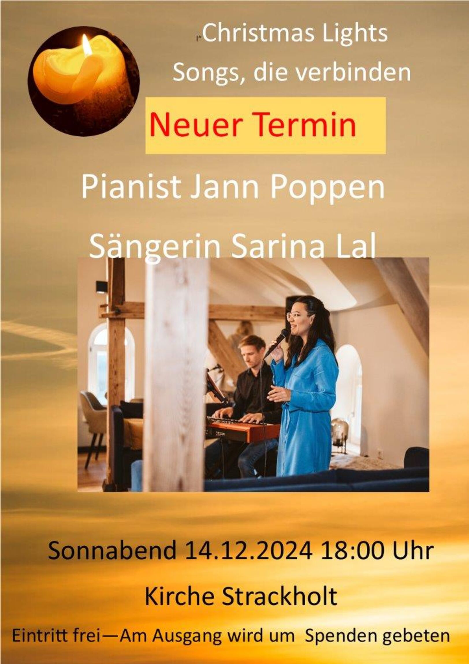 Leider musste das für Freitag, 06.12.2024, geplante Konzert "Christmas Lights" mit Jann Poppen aus Wiesmoor und Sarina Lal aus Oldenburg ausfallen. Die Künstler waren erkrankt. Neuer Termin: Samstag, 14.12.2024 um 18:00 Uhr.