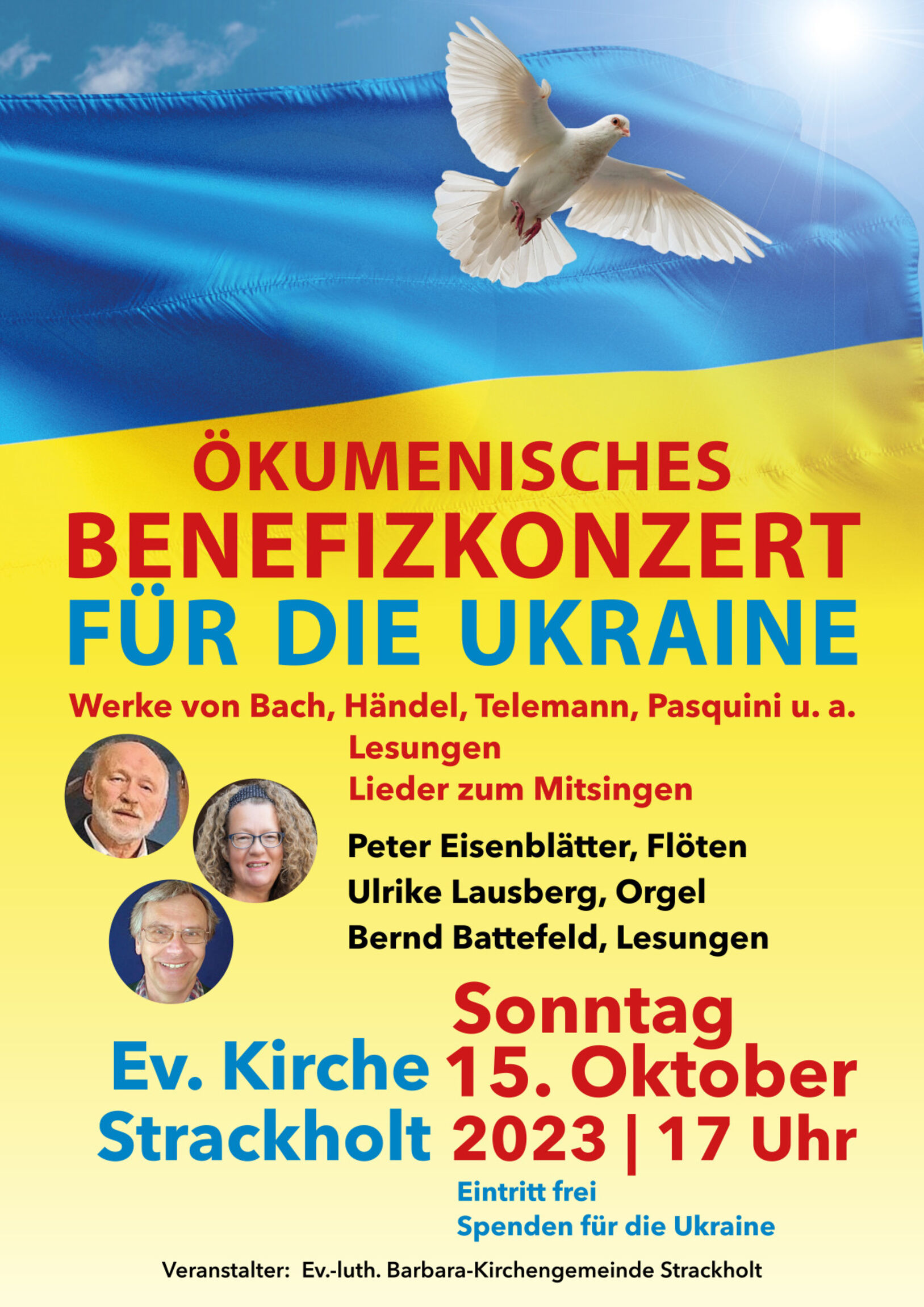ein Benefizkonzert für die Ukraine in der Ev. Barbara-Kirche in Strackholt statt. Die national und international bekannte Organistin Ulrike Lausberg aus Westfalen wird solistisch und im Duo mit Peter Eisenblätter, Flöten, Werke von Bach, Händel, Telemann, Loeillet u. a. auf der historischen Orgel spielen. Gemeinsam gesungene Lieder und Lesungen, vorgetragen von Bernd Battefeld, ergänzen das Programm. Die Ausführenden werden einige ihrer Lieblingsstücke zu Gehör bringen, darunter „Jesus bleibet meine Freude“ von Bach, die „Sarabande d-Moll con variazioni“, Sätze aus der „Wassermusik“ und einer Sonate von Händel und eine berührende, neue Friedenskomposition aus Norwegen.