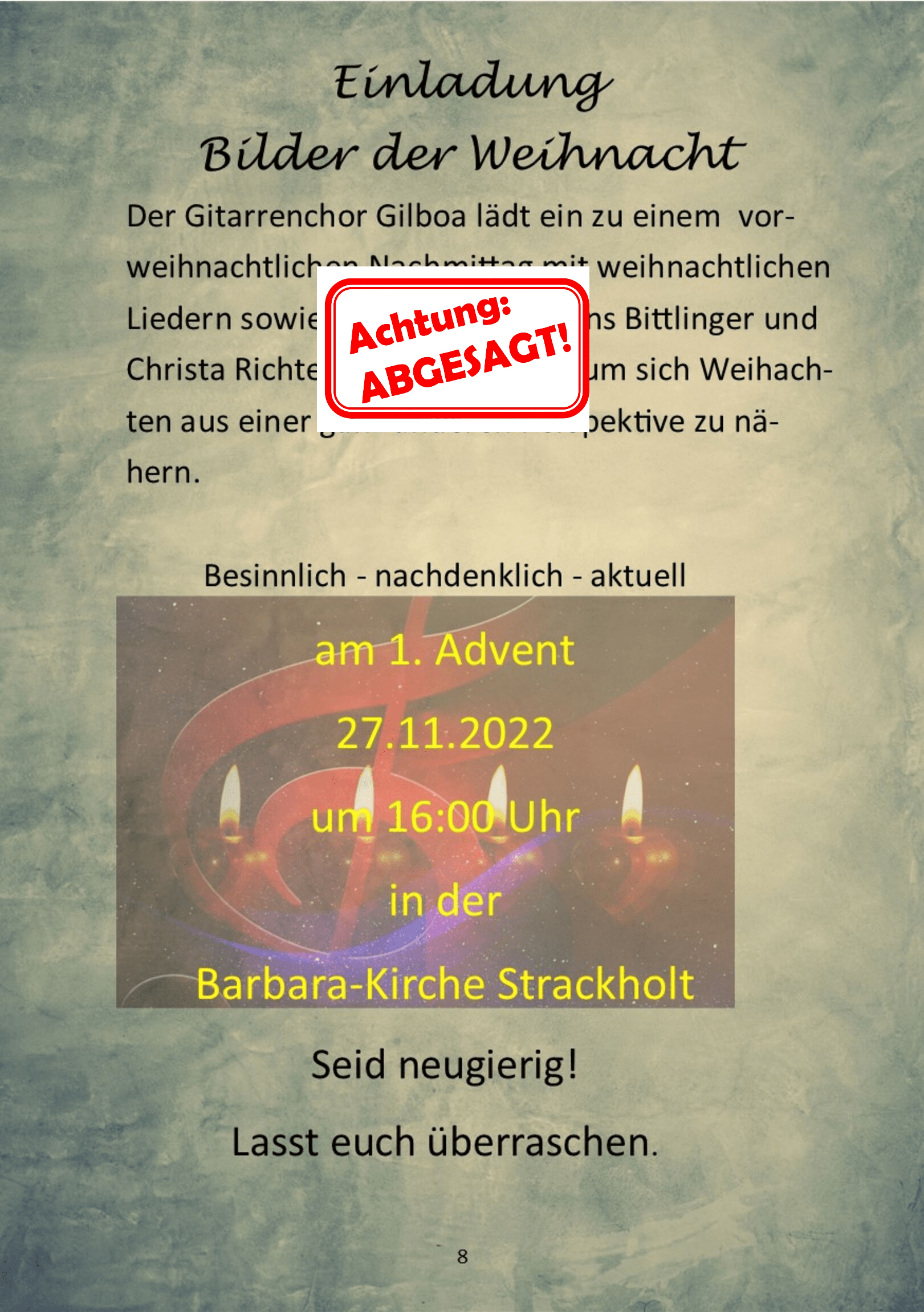 Der Gitarrenchor Gilboa lädt ein zu einem vorweihnachtlichen Nachmittag mit weihnachtlichen Liedern sowie Texten von Clemens Bittlinger und Christa Richter. Ein Nachmittag, um sich Weihachten aus einer ganz anderen Perspektive zu nähern.
