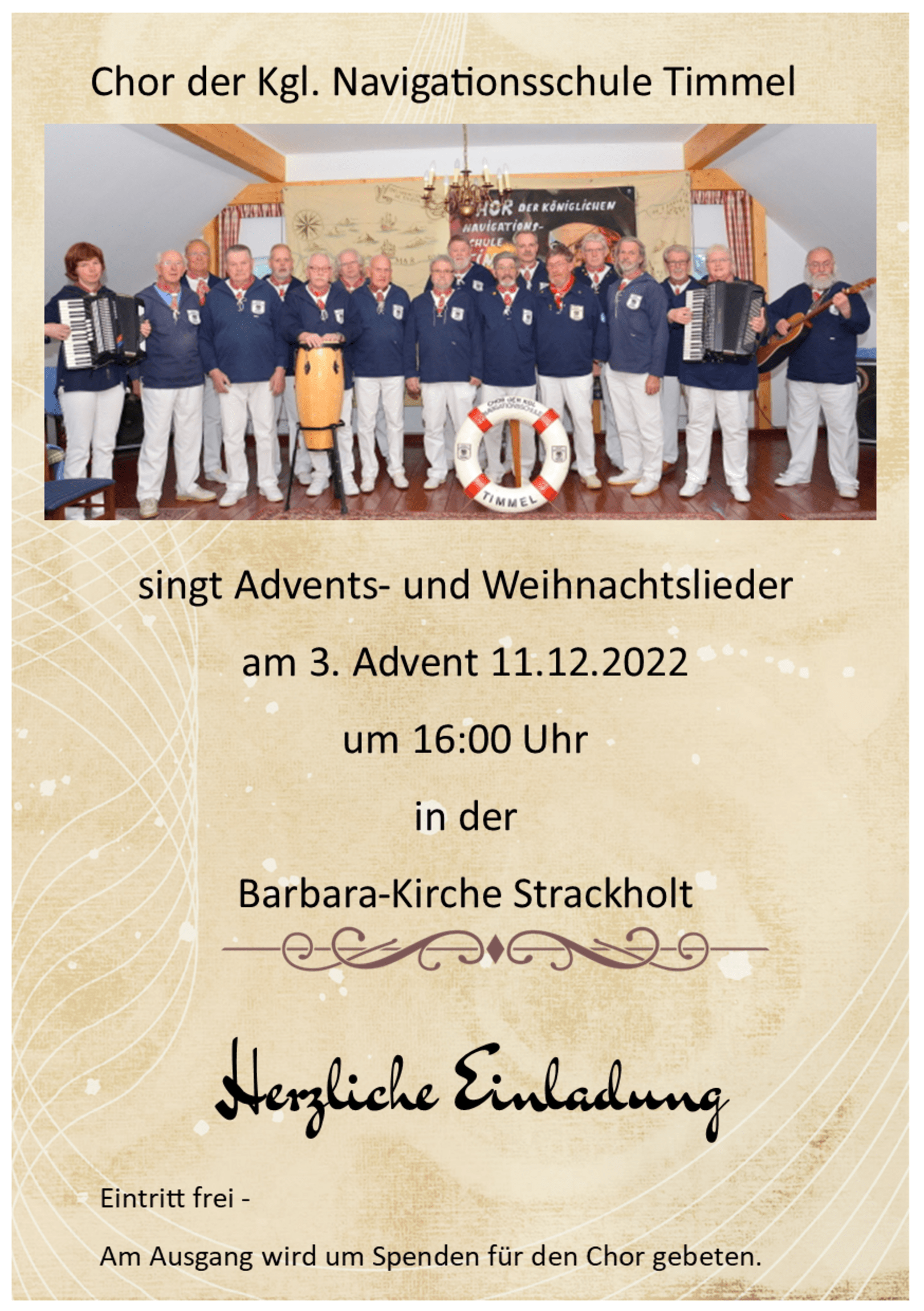 Am 3. Advent, 11.12.2022, freuen wir uns auf den Chor der KGL. NAVIGATIONSSCHULE TIMMEL.