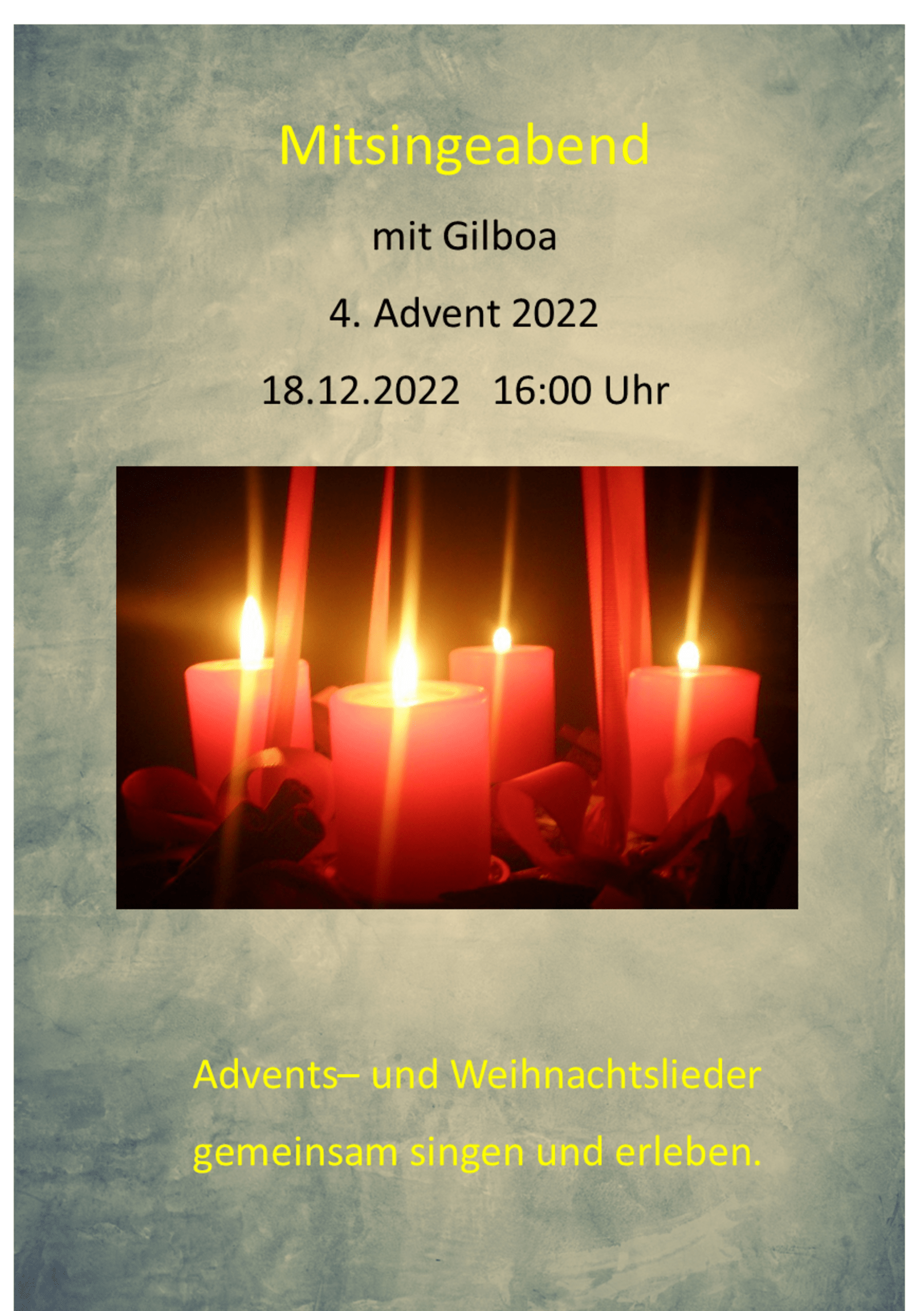 Am 4. Advent, 18.12.2022 lädt der Gitarrenchor Gilboa zum gemeinsamen Advents- und Weihnachtsliedersingen ein.