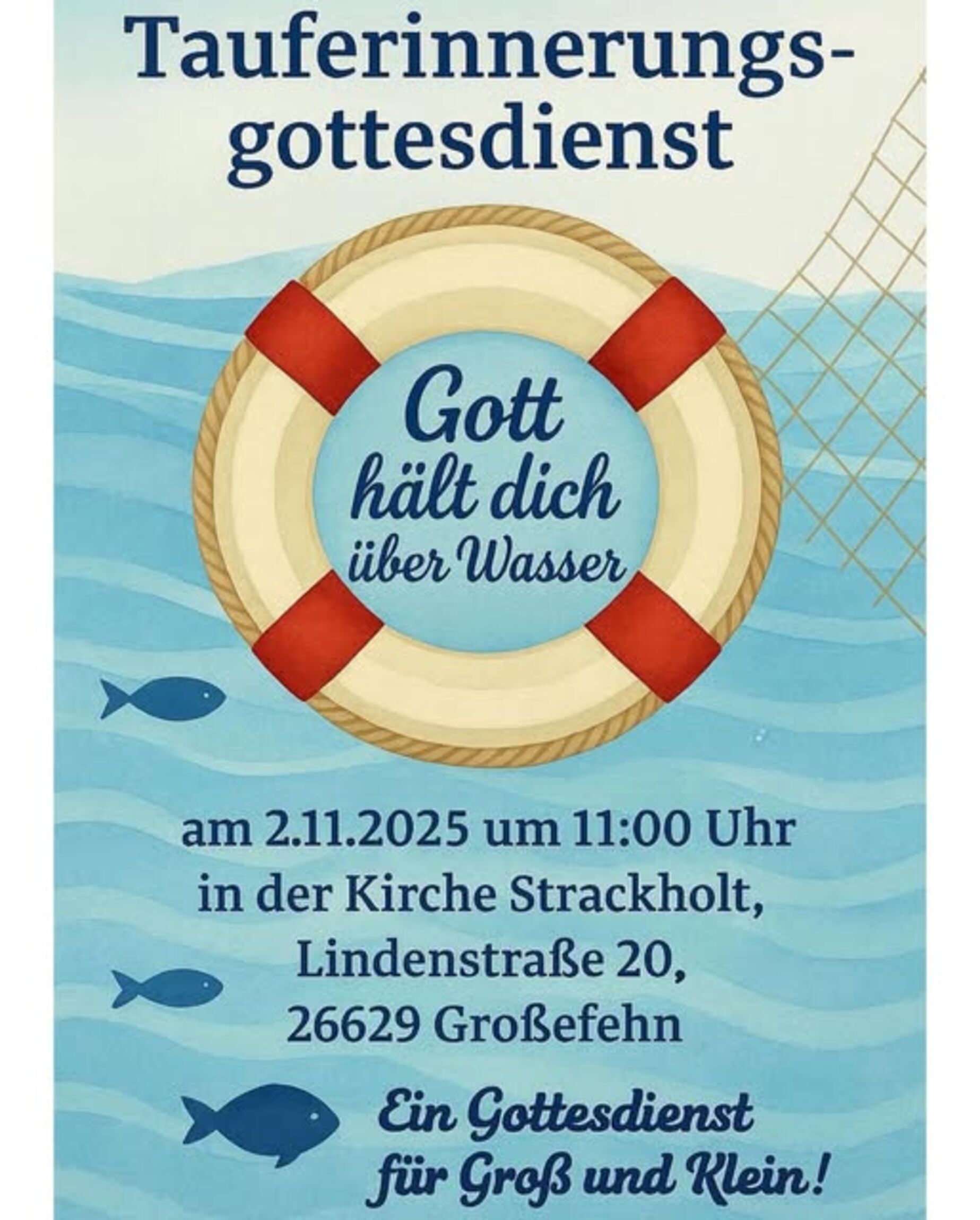 Der Gottesdienst am 02.11.2025 ist nicht wie im Gemeindebrief angekündigt um 10:00 Uhr sondern startet um 11:00 Uhr. Im Anschluss laden wir noch zu einen gemütlichen Zusammenkommen im Gemeindehaus ein.